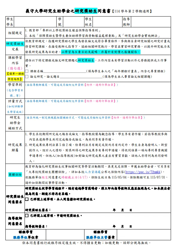 研究生助學金之研究獎助生同意書【114(1)】